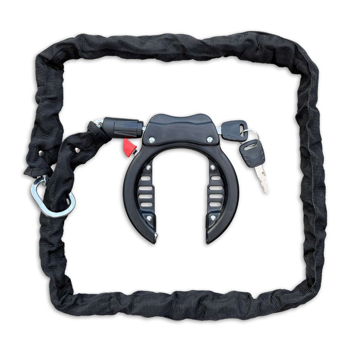 Het Lynx ringslot is anti-roest-poeder gecoat en wordt geleverd met een 100 cm lange zwarte insteekketting en 2 sleutels. Deze ketting is gemaakt van gehard staat, bevat een nylon hoes waardoor uw fiets beschadigd raakt en is tevens weerbestendig.