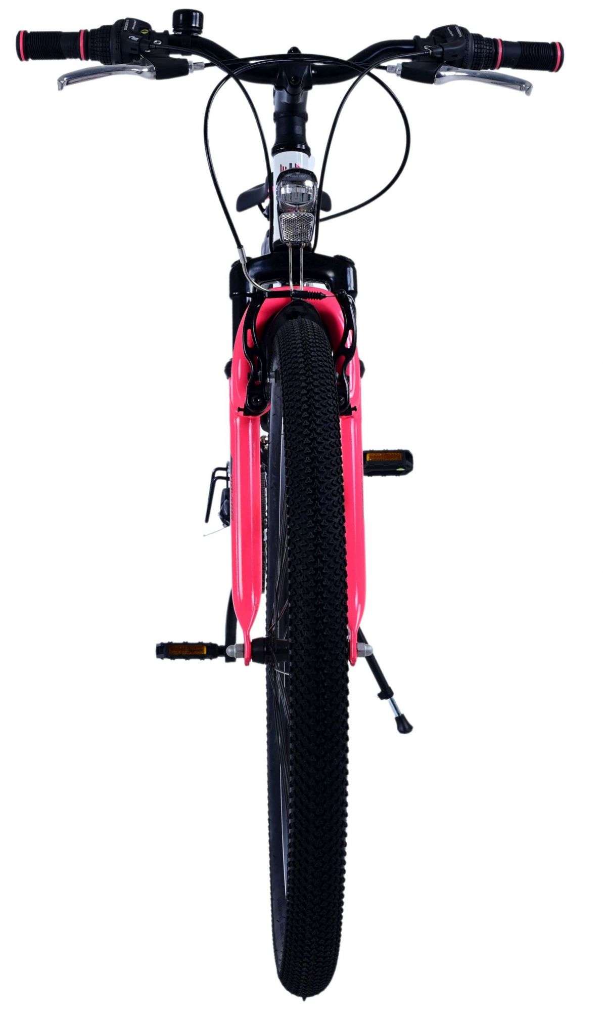 Veiligheid staat voorop! Daarom heeft deze gave fiets 2 handremmen en geen terugtraprem! Daarnaast heeft de fiets 21 versnellingen van shimano met revoshifters, reflectoren in de wielen, reflectoren voor en achter op de fiets, een bel, verlichting op batterijen voor en achter. De gekantelde stuurpen zorgt voor een beter zicht op de weg, maar is daardoor niet in hoogte verstelbaar. Ook aan het comfort is gedacht. De mooie witte Volare fiets met roze accenten heeft een comfortabel zacht zadel, een standaard zodat je fiets netjes blijft staan, en stoere extra brede banden. Om zo lang mogelijk van de fiets te kunnen genieten heeft de fiets een extra lange zadelpen waardoor de fiets nóg langer meegroeit.