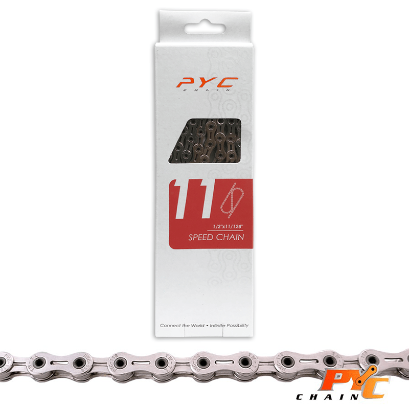 Deze Premium lichtgewicht PYC fietsketting is geschikt voor fietsen met 11 versnellingen. De ketting is geschikt voor fietsen met een Shimano, Campagnolo of SRAM derailleur systeem. De ketting is standaard voorzien van een slijtvaste oppervlaktebehandeling. Maar deze Premium uitvoering heeft een extra behandeling gehad, genaamd Chrome Harden Tech. Deze behandeling verhoogd de hardheid van de kettingonderdelen, wat de duurzaamheid en levensduur van de ketting sterk verbeterd. De ketting is licht van gewicht, dankzij de holle pennen en uitsparingen in de kettingplaten. De ketting heeft 116 schakels en een maat van 1/2 x 11/128 inch, inclusief connector link.